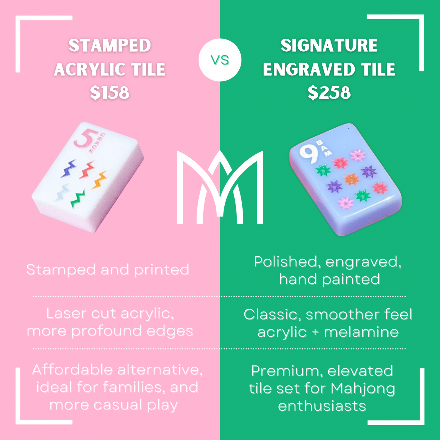 One of the reasons Amahj was started was to give enthusiasts a more wallet friendly option on tile sets. We are thrilled to be able to offer two different tile lines at two different price points- giving you the opportunity to own a set regardless of your budget.
