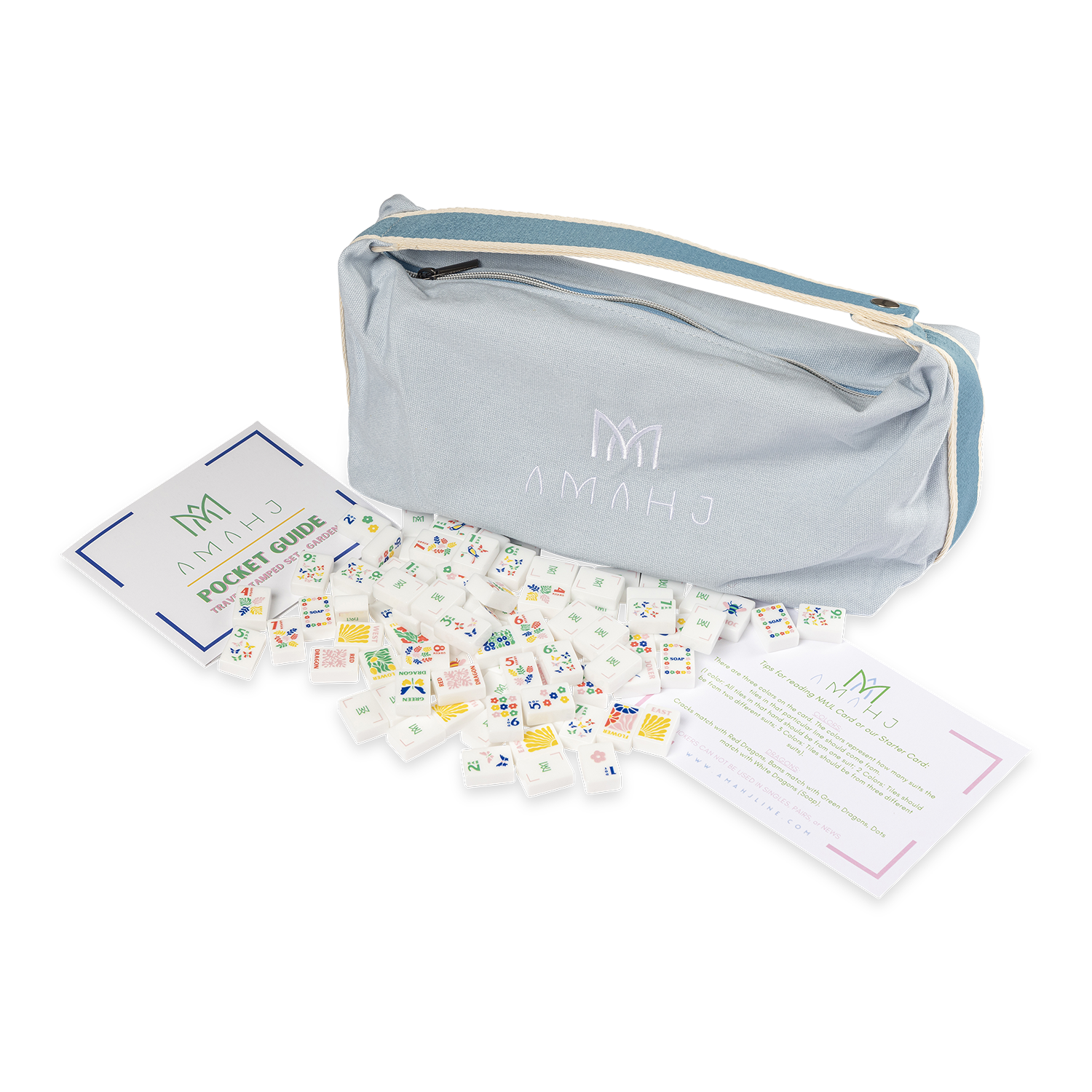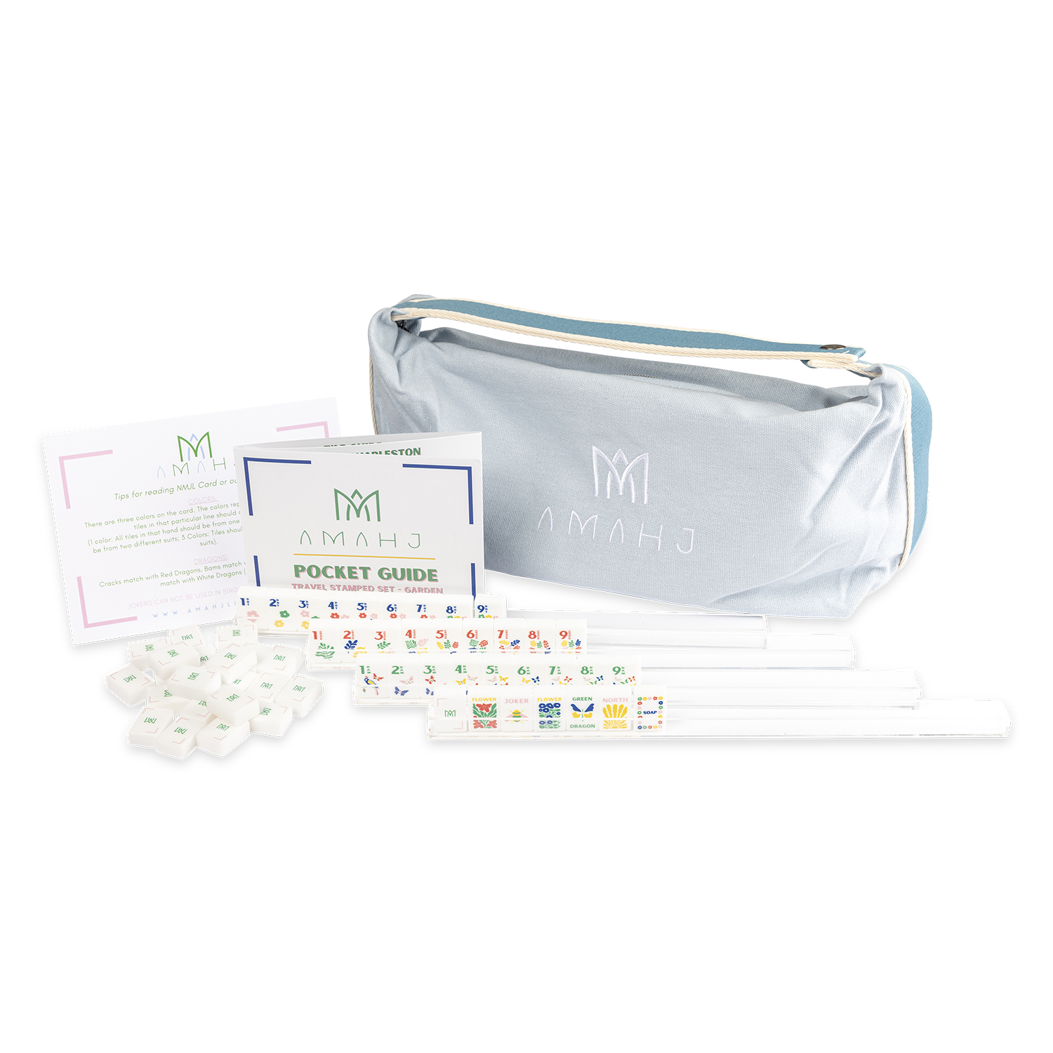 Signature Amahj tile tote bag, (4) Acrylic tile trays, Amahj pocket guide, 160 mini tiles (2.5cm x 1.8cm x 1cm)